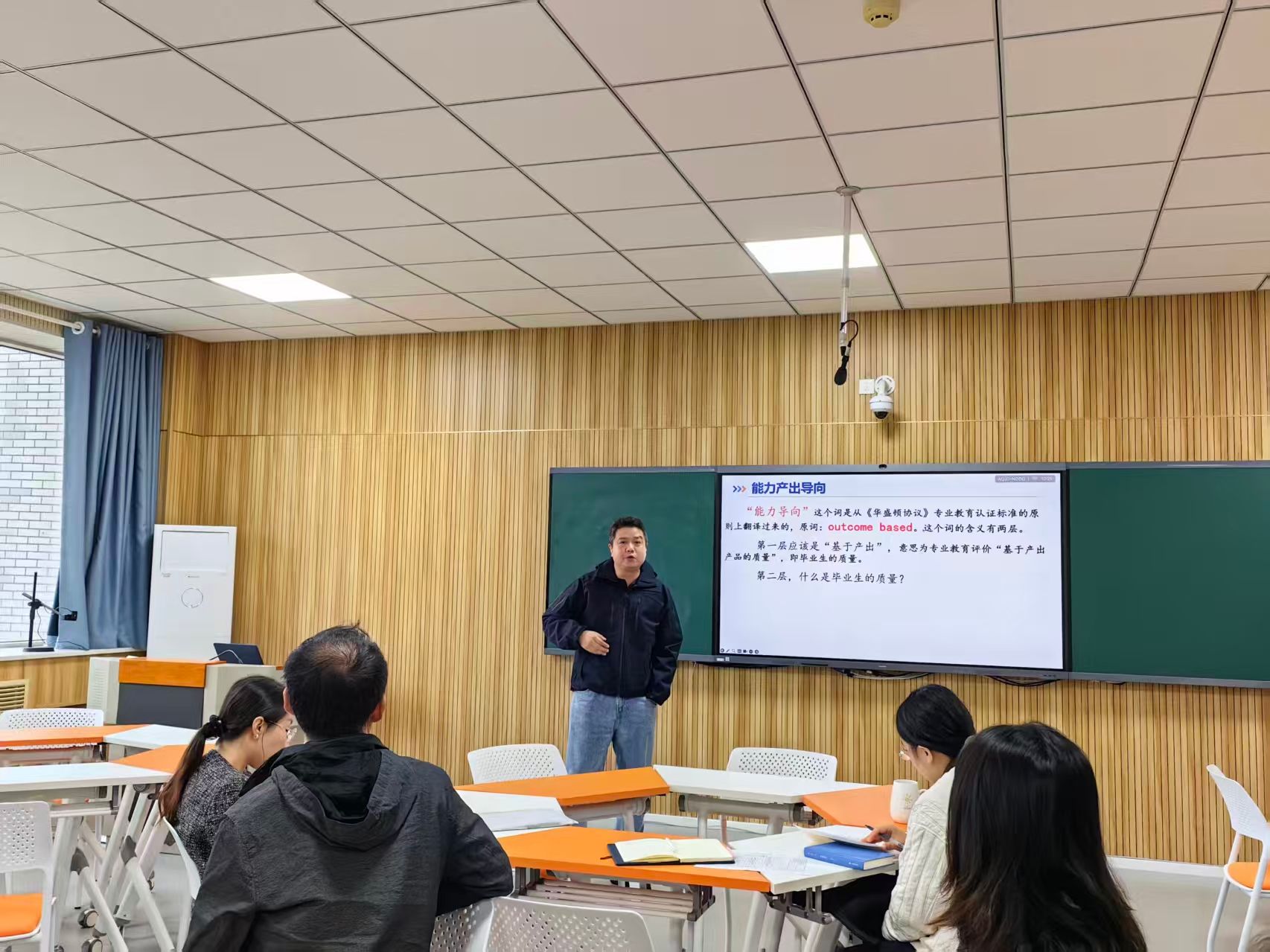 在培训环节,王鹏围绕OBE理念的核心要义、课程目标重构、教学活动设计、学习成果评价以及智慧教室技术工具的应用等方面展开深入讲解。生动阐释了如何基于OBE理念确定课程的核心能力目标,如何利用智慧教室的互动投屏、分组讨论、实时反馈等功能设计沉浸式教学活动,以及如何通过过程性评价与终结性评价相结合的方式,全面监测学生学习成果的达成情况。