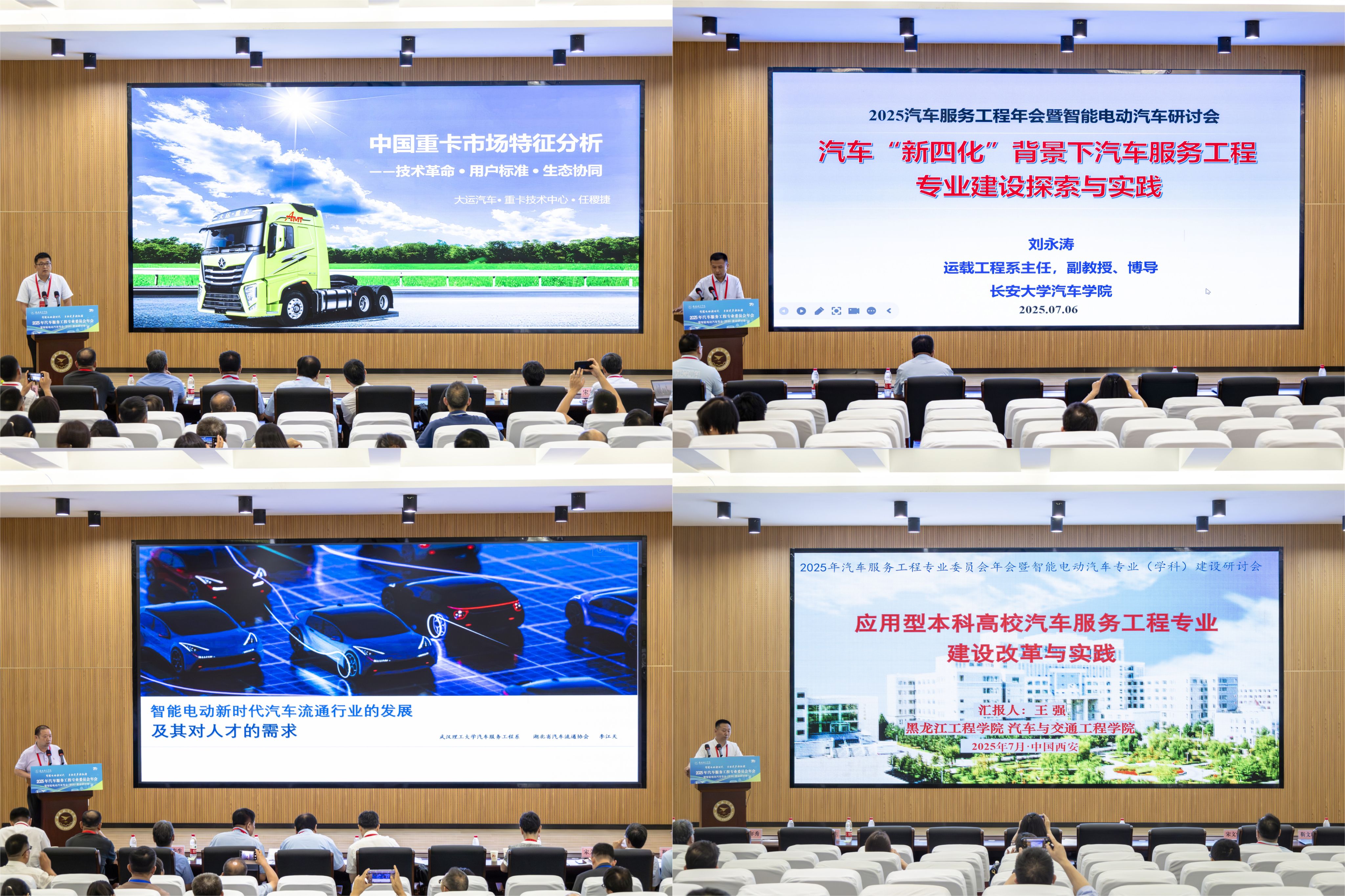上午的主题报告环节精彩纷呈。中国机械工业教育协会副理事长林松通过对比国内外典型教材案例,展现中外高等教育理念差异,提出新时代教材编写的发展趋势与新要求;西安航空学院副校长宋文学教授则结合学校深厚的航空特色优势资源,探讨了智能电动汽车发展与低空经济领域的融合,提出了培养复合应用型人才的新思路,阐释了协同育人的有效路径;武汉理工大学李江天、试飞院李志敏、大运汽车重卡技术部任稷杰以及西安航空学院刘超,分别围绕“智能电动新时代汽车流通行业发展与人才需求”“特种车辆应用场景”“中国重卡市场特征分析”“低空飞行器智能航电研发”等内容作了精彩报告,分享了最新研究成果和行业洞见。