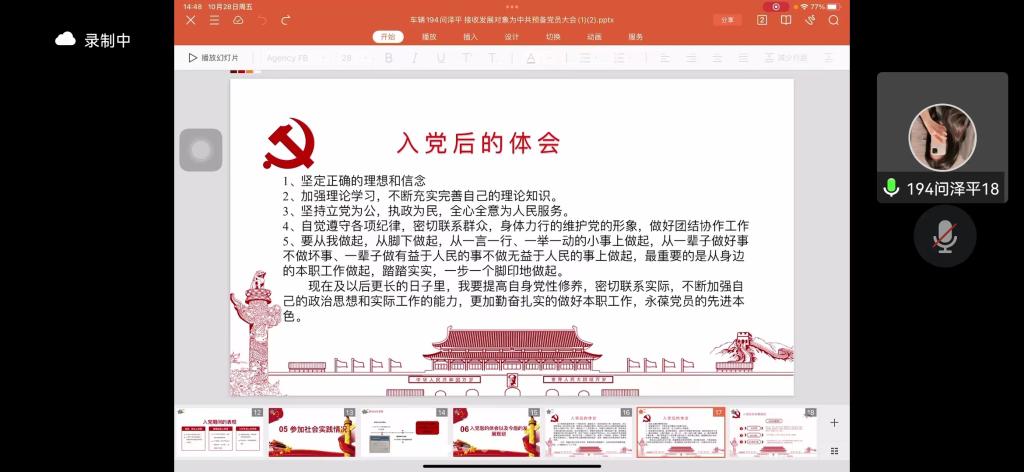 最后支部书记做总结讲话,向预备党员表示祝贺并提出希望与建议。希望学生党员们进一步提高政治素质,向身边优秀党员学习,严格按照党员的标准来要求自己,履行党员应尽的义务,将理论与实践相结合,发挥共产党员的先锋模范作用。(文/车辆工程学院 金雪 图/车辆工学院 丁玉立)