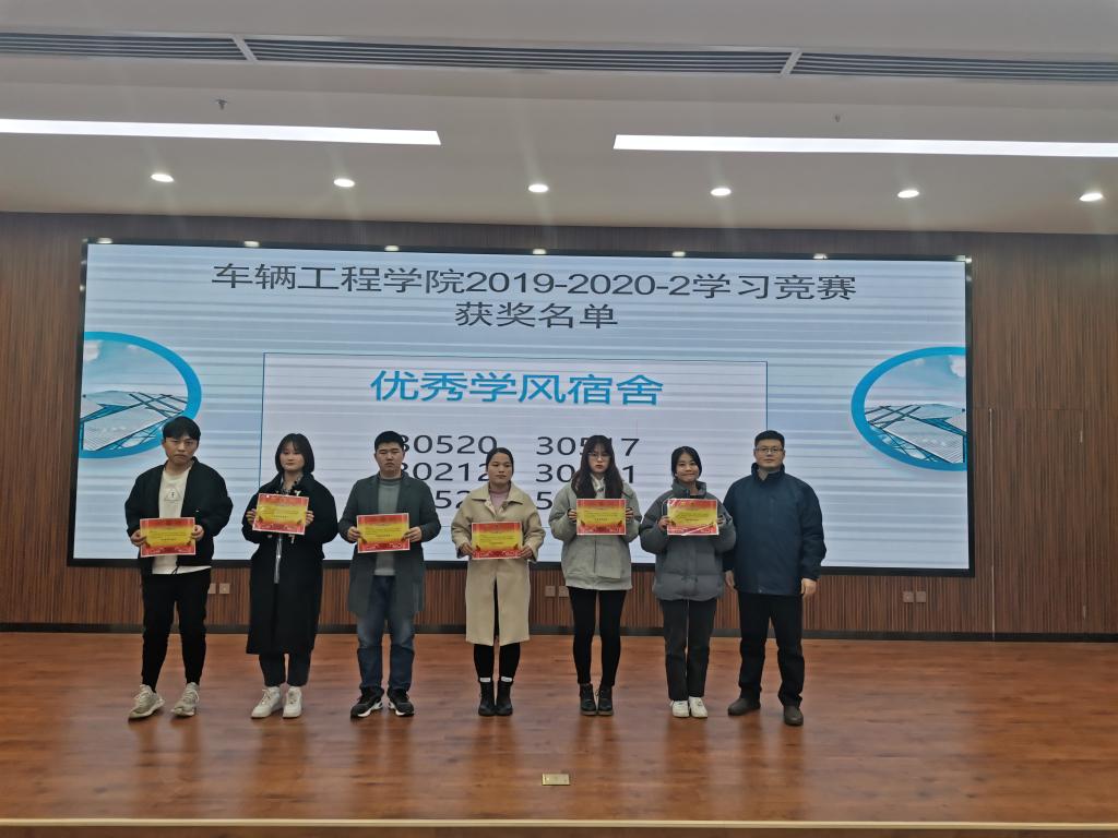 首先,学院往年优秀毕业生通过视频送上了对母校的祝福和对学弟学妹们的期望。院长张耀虎宣读《关于车辆工程学院2019-2020-2学习竞赛中优秀个人、优秀学风班、优秀学风宿舍、互助对子的决定》。到场嘉宾及学院领导为获得表彰的学生颁发证书及奖品。四位同学深情地诵读彰显学院学风而创作的《车辆学子》,展现了车辆学子意气风发勇往直前的精神面貌。获奖学生代表胥振哲进行了发言。最后,党总支书记邓北川对学院学风现状和评估期间同学们的表现予以肯定,希望同学们能戒骄戒躁带领全宿舍、全班级以及全学院的学风建设更上一层楼。