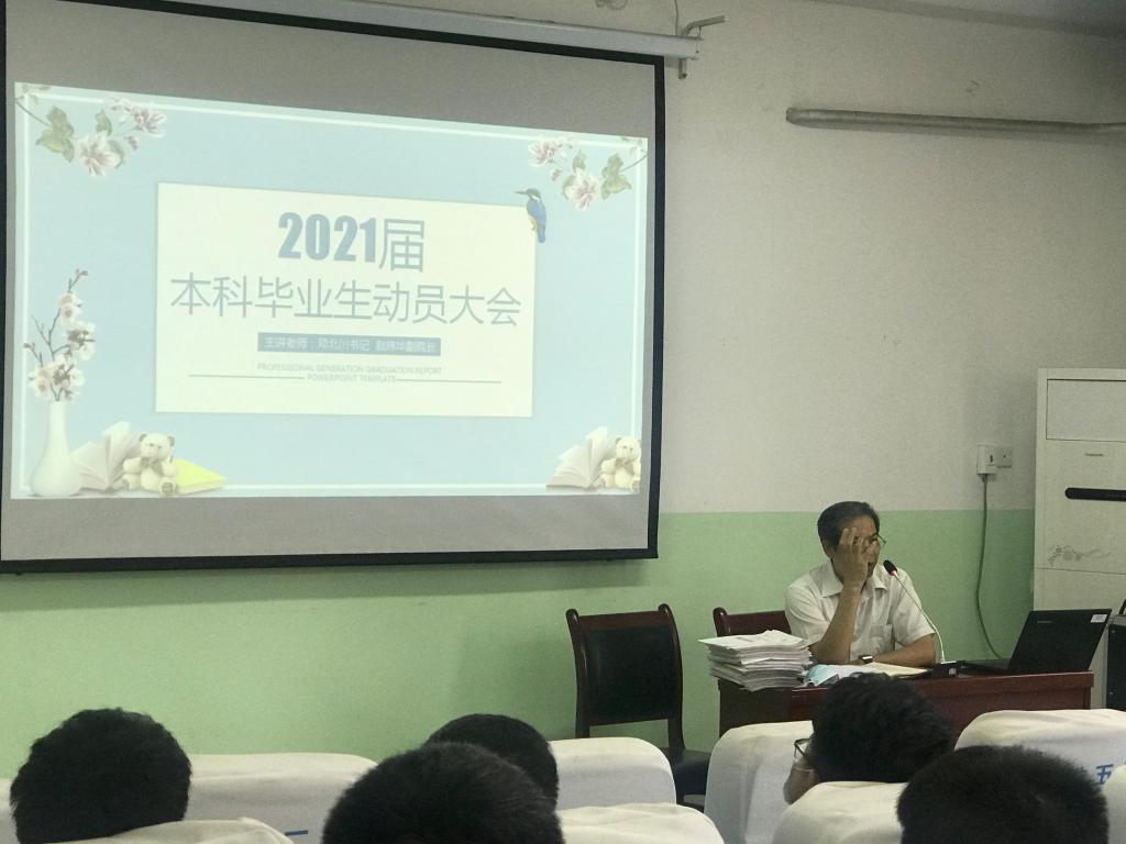 会上,邓北川要求广大同学调整个人的心态、状态及态度,以更加饱满的热情投入到即将到来的就业和毕业设计等工作中来,他强调:广大同学要树立先就业后择业的就业观,利用即将到来的暑假想清楚自己的就业意向、就业地域等问题;做好个人自荐书及就业中面试、笔试的各项准备工作并鼓励大家提升能力走出去开阔个人视野,做好就业准备工作。做到就业与学业两不误、两促进。赵炜华副院长强调了课业的重要性及毕业设计的相关安排与要求。赵坤重点就与毕业生相关的教学环节内容、学籍管理要求、获取毕业证、学位证的条件等作了详细说明,并要求同学们正确处理就业与学习的关系。最后,于思月向2021届毕业生通报了2020届毕业生截止目前的就业情况,强调了毕业生纪律,并针对以往在就业中的误区及就业中的错误认识进行教育、指导。