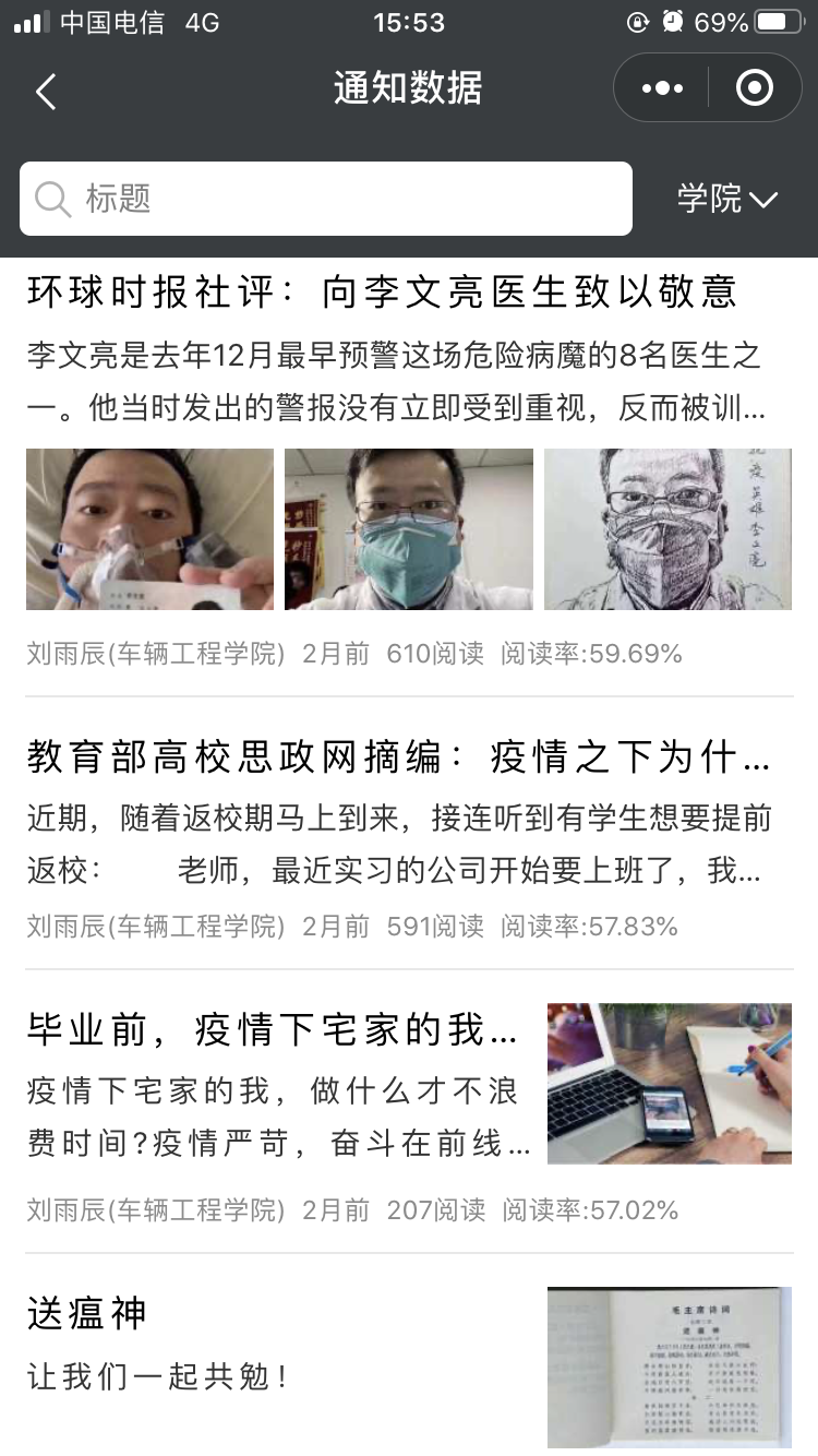 抗击疫情期间,学院不忘丰富广大同学的课余生活,为广大同学传递正能量。自疫情爆发以来,学院在微信公众号、抖音公众号及“我在校园”小程序中分别推送了“武汉,加油”等视频十余个、“毕业前,疫情下,宅家的我,做什么才不浪费时间”等文章二十余篇。鼓励广大同学利用线上资源增强文献阅读,提高个人学术水平,充实度过假期与疫情期。此外,学院依托校心理咨询中心,告知全体学生在疫情防控期间的心理调节方式,通知线上师生疫情心理援助平台的操作和使用办法,帮助广大师生缓解对疫情恐慌、焦虑等应激心理反应,做好心理危机干预工作。